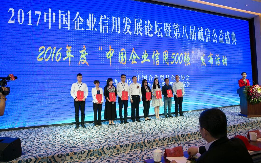 2017年4月23日,由中國(guó)合作貿(mào)易企業(yè)協(xié)會(huì)、中國(guó)企業(yè)改革與發(fā)展研究會(huì)聯(lián)合主辦的“2017中國(guó)企業(yè)信用發(fā)展論壇暨第八屆誠(chéng)信公益盛典”在京隆重召開。論壇上發(fā)布了2016年度中國(guó)企業(yè)信用500強(qiáng)、中國(guó)制造業(yè)企業(yè)信用100強(qiáng)、中國(guó)服務(wù)業(yè)企業(yè)信用100強(qiáng)、中國(guó)民營(yíng)企業(yè)信用100強(qiáng)、中國(guó)上市公司信用100強(qiáng)(詳見《中國(guó)企業(yè)信用發(fā)展報(bào)告2016》)。其中,中國(guó)企業(yè)信用500強(qiáng)為第五次發(fā)布,也是第二次由原來(lái)的信用100強(qiáng)擴(kuò)充為信用500強(qiáng);中國(guó)制造業(yè)企業(yè)信用100強(qiáng)、中國(guó)服務(wù)業(yè)企業(yè)信用100強(qiáng)為第四次發(fā)布;中國(guó)民營(yíng)企業(yè)信用100強(qiáng)為第三次發(fā)布;中國(guó)上市公司信用100強(qiáng)為第二次發(fā)布。