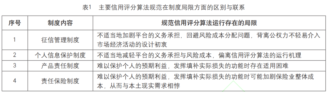 平臺生產(chǎn)的信用評分不僅為數(shù)字經(jīng)濟(jì)活動傳導(dǎo)風(fēng)險(xiǎn)信號,也是數(shù)字信用共治的有效工具。信用評分具有一定的公共物品屬性。信用評分算法治理既是公法上的命題,也是私法上的命題。其主要涉及征信管理制度、個(gè)人信息保護(hù)制度、產(chǎn)品責(zé)任制度與責(zé)任保險(xiǎn)制度等法律規(guī)范(參見表1)。其中,前兩類制度一般統(tǒng)稱為個(gè)人征信制度。四類制度規(guī)范在回應(yīng)信用評分算法運(yùn)行的特定技術(shù)風(fēng)險(xiǎn)時(shí),不同程度地存在主體利益保護(hù)不周延、技術(shù)風(fēng)險(xiǎn)分配不均衡問題。