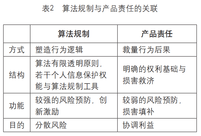 兩者在規(guī)范方式、結(jié)構(gòu)、功能、目的方面互為補(bǔ)充(參見表2)。算法規(guī)制并不挑戰(zhàn)產(chǎn)品責(zé)任,而是為產(chǎn)品責(zé)任的有效性提供識別與量化風(fēng)險(xiǎn)的必要知識,向個(gè)人提供更充分的防御手段和更豐富的救濟(jì)途徑,從而在根本上解決信用評分算法運(yùn)行對個(gè)人預(yù)期利益帶來的危險(xiǎn)。產(chǎn)品責(zé)任也須通過算法規(guī)制確立的行為準(zhǔn)則,為主體利益協(xié)調(diào)提供制度支持。在這個(gè)意義上,兩者具有整合形成新型信用評分算法治理方案的可能。