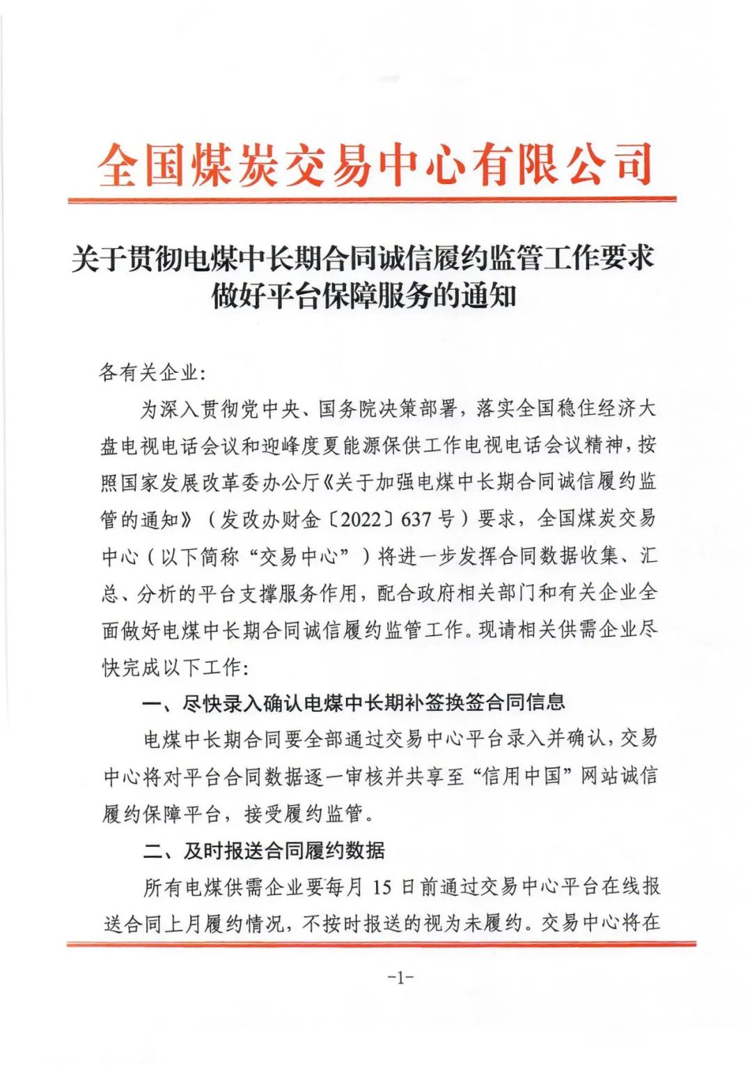 近日,全國煤炭交易中心公開發(fā)布“關(guān)于貫徹電煤中長期合同誠信履約監(jiān)管工作要求做好平臺保障服務(wù)的通知”,提出將進一步發(fā)揮合同數(shù)據(jù)收集、匯總、分析的平臺支撐服務(wù)作用,配合政府相關(guān)部門和有關(guān)企業(yè)全面做好電煤中長期合同誠信履約監(jiān)管工作。