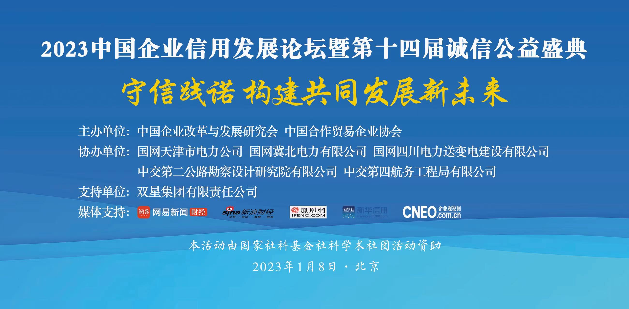 1月8日,2023中國企業(yè)信用發(fā)展論壇暨第十四屆誠信公益盛典在京成功召開。本次論壇由中國企業(yè)改革與發(fā)展研究會(huì)、中國合作貿(mào)易企業(yè)協(xié)會(huì)主辦,國網(wǎng)天津市電力公司、國網(wǎng)冀北電力有限公司、國網(wǎng)四川電力送變電建設(shè)有限公司、中交第二公路勘察設(shè)計(jì)研究院有限公司、中交第四航務(wù)工程局有限公司協(xié)辦,雙星集團(tuán)有限責(zé)任公司支持,國家社科基金社科學(xué)術(shù)社團(tuán)活動(dòng)資助。根據(jù)疫情防控相關(guān)要求,本次論壇采用線上線下相結(jié)合的方式舉行,北京廣播電視臺(tái)主持人王新星主持論壇,新華信用、新浪財(cái)經(jīng)、網(wǎng)易財(cái)經(jīng)、鳳凰網(wǎng)、企業(yè)觀察網(wǎng)、中國企研視頻號(hào)、企業(yè)思想家視頻號(hào)同步直播,企業(yè)觀察報(bào)專版報(bào)道。