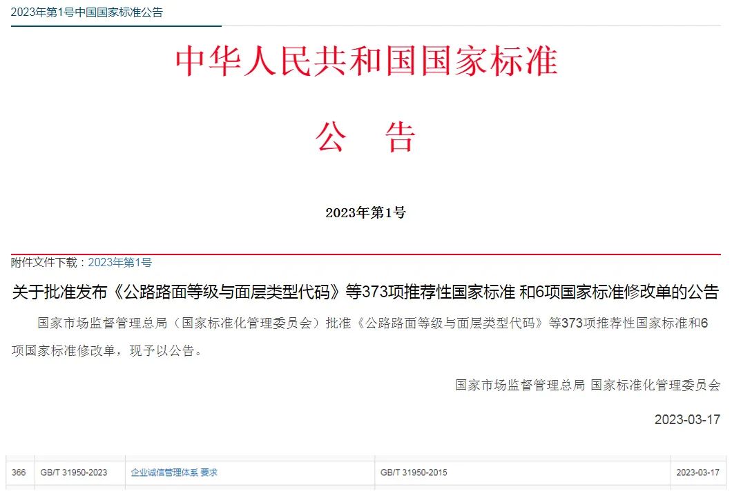 3月17日,國家市場監(jiān)督管理總局(國家標(biāo)準(zhǔn)化管理委員會(huì))發(fā)布2023年第1號(hào)公告,批準(zhǔn)發(fā)布373項(xiàng)推薦性國家標(biāo)準(zhǔn)和6項(xiàng)國家標(biāo)準(zhǔn)修改單。由中國企業(yè)改革與發(fā)展研究會(huì)、中國合作貿(mào)易企業(yè)協(xié)會(huì)牽頭起草的《企業(yè)誠信管理體系 要求》(GB/T 31950-2023)正式發(fā)布,自2023年3月17日起實(shí)施。