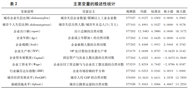 i表示企業(yè),c為城市,t是年份。本文的被解釋變量為企業(yè)出口額變量(export);dishonesty為核心解釋變量,表示城市信用水平,由地級(jí)市失信自然人比例(dishonestyperson)與失信法人比例(dishonestypfirm)共同測(cè)度,失信人比例越高,城市信用水平越低。X是一系列控制變量的集合,包括企業(yè)、行業(yè)和城市層面時(shí)變變量。λi和δt分別為企業(yè)和年份固定效應(yīng)。為排除不同城市企業(yè)出口本身的規(guī)律性變化,本文在回歸方程中加入城市的線性時(shí)間趨勢(shì)t×μc,以控制不同城市出口的潛在差異性變化。εict表示隨機(jī)擾動(dòng)項(xiàng)??紤]到極端值對(duì)回歸結(jié)果造成的影響,在實(shí)證研究中本文對(duì)連續(xù)變量進(jìn)行上下1%分位數(shù)縮尾處理。為解決誤差項(xiàng)可能存在的異方差和序列相關(guān)問(wèn)題,本文將標(biāo)準(zhǔn)誤在企業(yè)維度上進(jìn)行調(diào)整。