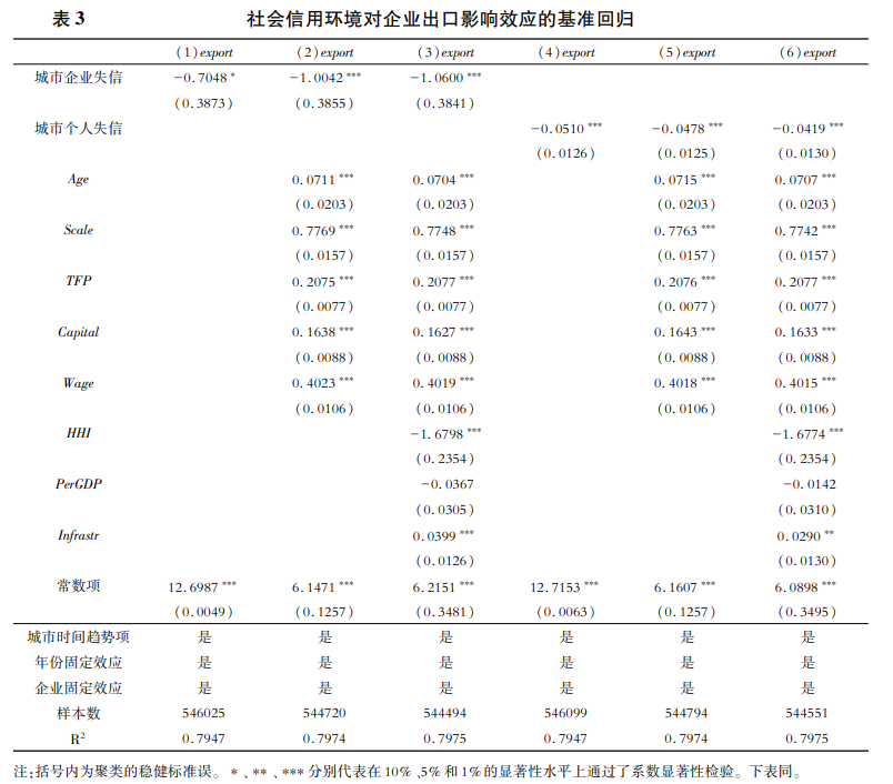 本文選取中國(guó)283個(gè)城市2000~2013年中國(guó)工業(yè)企業(yè)數(shù)據(jù)為研究樣本,采用最高人民法院公布的失信被執(zhí)行人數(shù)據(jù)構(gòu)建中國(guó)城市的信用水平指標(biāo),并與中國(guó)工業(yè)企業(yè)數(shù)據(jù)和中國(guó)海關(guān)進(jìn)出口數(shù)據(jù)匹配,研究城市信用水平對(duì)中國(guó)制造業(yè)企業(yè)出口的影響,并且探究其主要的作用機(jī)制。研究發(fā)現(xiàn):第一,城市失信被執(zhí)行人數(shù)量的增加不利于企業(yè)出口,城市失信企業(yè)與規(guī)模以上工業(yè)企業(yè)之比每上升1%,企業(yè)出口額下降約1.0600%,城市每萬(wàn)人中失信自然人數(shù)增加1%,企業(yè)出口額降低約0.0419%。第二,中間機(jī)制檢驗(yàn)結(jié)果顯示,城市社會(huì)失信會(huì)加劇企業(yè)面臨融資約束問(wèn)題并增加其融資成本,也會(huì)提高企業(yè)交易成本和降低企業(yè)的交易效率,從而限制企業(yè)的出口。第三,異質(zhì)性的研究表明,民營(yíng)企業(yè)、規(guī)模較小企業(yè)和東部地區(qū)所在企業(yè)的出口更易受到地區(qū)失信水平的影響,城市異地失信人比例越高越不利于企業(yè)出口。在外需疲軟、區(qū)域沖突加劇的背景下,習(xí)近平總書(shū)記指出要穩(wěn)住外貿(mào)外資基本盤(pán),本文的研究對(duì)穩(wěn)外貿(mào)具有一定的政策啟示,即城市信用水平的提高可以改善企業(yè)的融資情況和提升企業(yè)的分工水平,進(jìn)而從根本上提升企業(yè)競(jìng)爭(zhēng)力和促進(jìn)企業(yè)出口。