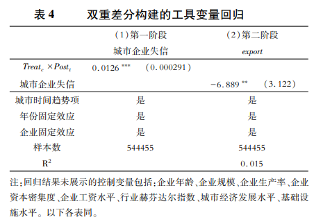 表4匯報(bào)了以限制高消費(fèi)政策沖擊作為城市信用水平工具變量的實(shí)證檢驗(yàn)結(jié)果。列(1)中,第一階段回歸結(jié)果顯示,Treatc×Postt系數(shù)顯著為正,說(shuō)明政策沖擊作為工具變量符合相關(guān)性要求。在列(2)中,利用一階段擬合值代替基準(zhǔn)回歸模型中的企業(yè)失信,結(jié)果表明其對(duì)企業(yè)出口的影響顯著為負(fù),在符號(hào)和方向上均與式(1)的基準(zhǔn)回歸結(jié)果保持一致。