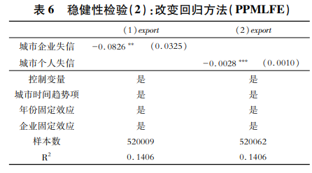 由于大量企業(yè)存在零貿(mào)易情況,企業(yè)出口量存在較多零值,本文采用面板固定效應(yīng)的方法評(píng)估社會(huì)信用環(huán)境對(duì)企業(yè)出口的影響,為了檢驗(yàn)計(jì)量方法的穩(wěn)健性,本文又采用泊松擬似然固定效應(yīng)(PPMLFE)方法對(duì)基準(zhǔn)模型進(jìn)行檢驗(yàn),從而更好地解決處理模型中零值較多的問(wèn)題,回歸結(jié)果如表6所示。