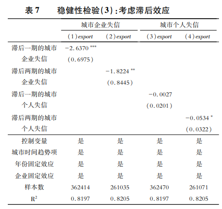為考慮失信被執(zhí)行人數(shù)量增加引起的城市信用環(huán)境變化對(duì)企業(yè)出口的長(zhǎng)期影響,本文對(duì)由城市企業(yè)失信和城市個(gè)人失信測(cè)度的城市信用環(huán)境分別進(jìn)行滯后一期和滯后兩期的處理。具體情況如表7所示,對(duì)于城市企業(yè)失信回歸系數(shù)方向和顯著性均無(wú)明顯差異,對(duì)于城市個(gè)人失信,當(dāng)期城市失信人數(shù)量所占比例對(duì)所在地企業(yè)出口影響可能存在時(shí)滯。