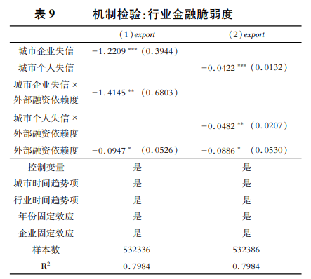 表9列(1)和列(2)分別顯示城市企業(yè)失信和城市個(gè)人失信度量的社會(huì)信用環(huán)境與行業(yè)的外部融資依賴(lài)交互的回歸結(jié)果,可以看出越依賴(lài)融資的行業(yè),其所在行業(yè)企業(yè)出口越容易受到城市失信的影響。