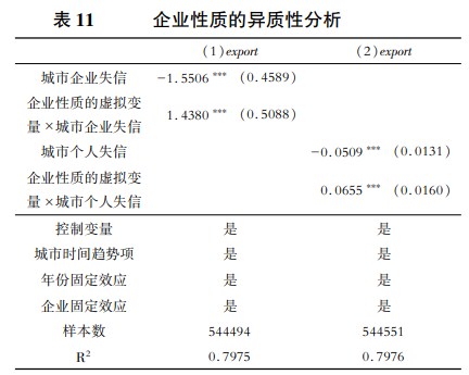 本文以企業(yè)注冊(cè)投資資本所占比重作為企業(yè)性質(zhì)的劃分標(biāo)準(zhǔn),并設(shè)定企業(yè)性質(zhì)的虛擬變量,將國(guó)有企業(yè)賦值為1,非國(guó)有企業(yè)賦值為0,在此基礎(chǔ)上探究社會(huì)信用環(huán)境對(duì)于不同性質(zhì)企業(yè)的異質(zhì)性影響。如表11所示,企業(yè)性質(zhì)虛擬變量與城市企業(yè)失信和城市個(gè)人失信交互項(xiàng)均顯著為正,表明國(guó)有企業(yè)規(guī)模較大,資金較為充足,同時(shí)有政府背書(shū),抵御外部不利環(huán)境影響的能力較強(qiáng),因此在失信環(huán)境下非國(guó)有企業(yè)出口規(guī)模更易受到影響,上述分析初步驗(yàn)證了假設(shè)2。
