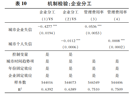 由于企業(yè)外部交易成本無(wú)法直接度量,本文利用管理費(fèi)用率即管理費(fèi)用與主營(yíng)收入的比率作為企業(yè)外部交易成本的代理變量,驗(yàn)證社會(huì)信用環(huán)境惡化通過(guò)抑制企業(yè)專(zhuān)業(yè)化生產(chǎn)進(jìn)而導(dǎo)致企業(yè)出口數(shù)量減少的作用機(jī)制。社會(huì)信用水平差的地區(qū),企業(yè)在生產(chǎn)交易中需支付更多的關(guān)系費(fèi)用,進(jìn)而提高企業(yè)的外部交易成本,不利于企業(yè)專(zhuān)業(yè)化生產(chǎn)。表10列(3)和列(4)顯示,企業(yè)失信和個(gè)人失信數(shù)量增加帶來(lái)的社會(huì)信用水平惡化顯著提高企業(yè)管理費(fèi)用率,這說(shuō)明法律案件執(zhí)行效率低使得所在城市的企業(yè)社會(huì)環(huán)境變差,這將提高企業(yè)交易中隱性交易成本,降低企業(yè)專(zhuān)業(yè)化生產(chǎn)水平,進(jìn)而使得所在地企業(yè)出口數(shù)量降低。