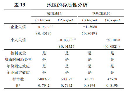 為了檢驗(yàn)社會(huì)失信對(duì)不同地區(qū)企業(yè)出口的影響,本文將中國(guó)各省份劃分為東部地區(qū)和中西部地區(qū),表13報(bào)告了社會(huì)信用環(huán)境對(duì)東部地區(qū)和中西部地區(qū)企業(yè)出口的異質(zhì)性影響。結(jié)果顯示城市失信水平的衡量指標(biāo)在東部地區(qū)顯著為負(fù),而在中西部地區(qū),雖然系數(shù)為負(fù),但并不顯著。中國(guó)地區(qū)間經(jīng)濟(jì)發(fā)展水平差異較大,東部地區(qū)一般為經(jīng)濟(jì)較發(fā)達(dá)的沿海省份,法制建設(shè)完善,執(zhí)法效率較高,所在企業(yè)一旦失信所面臨的法律懲罰較大,因此東部地區(qū)城市失信被執(zhí)行人數(shù)量增加帶來(lái)的信用水平降低不利于企業(yè)出口。中西部地區(qū)多為內(nèi)陸省份,經(jīng)濟(jì)發(fā)展與市場(chǎng)化進(jìn)程相對(duì)緩慢,法制建設(shè)仍有不足,執(zhí)法效率有待提高,企業(yè)失信的代價(jià)也十分有限,從而限制了社會(huì)信用環(huán)境變差對(duì)企業(yè)出口的不利影響,初步驗(yàn)證了假設(shè)4。
