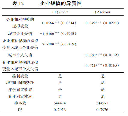為進(jìn)一步驗(yàn)證社會(huì)信用環(huán)境對(duì)不同規(guī)模企業(yè)的影響,本文按職工人數(shù)中位數(shù)作為企業(yè)規(guī)模的劃分標(biāo)準(zhǔn),定義職工人數(shù)在當(dāng)年中位數(shù)以上的企業(yè)為較大規(guī)模企業(yè)并賦值為1,在中位數(shù)以下的企業(yè)為較小規(guī)模企業(yè)并賦值為0,并將企業(yè)相對(duì)規(guī)模虛擬變量與企業(yè)失信和個(gè)人失信變量分別交互后加入模型中。表12列(1)和列(2)分別顯示城市企業(yè)失信和城市個(gè)人失信的估計(jì)結(jié)果,大規(guī)模企業(yè)通常有充足的擔(dān)保物,可抵押資產(chǎn)相對(duì)較多,面臨的融資約束相對(duì)較小,因此較大規(guī)模企業(yè)可抵御失信環(huán)境對(duì)企業(yè)出口的不利影響,初步驗(yàn)證了假設(shè)3。