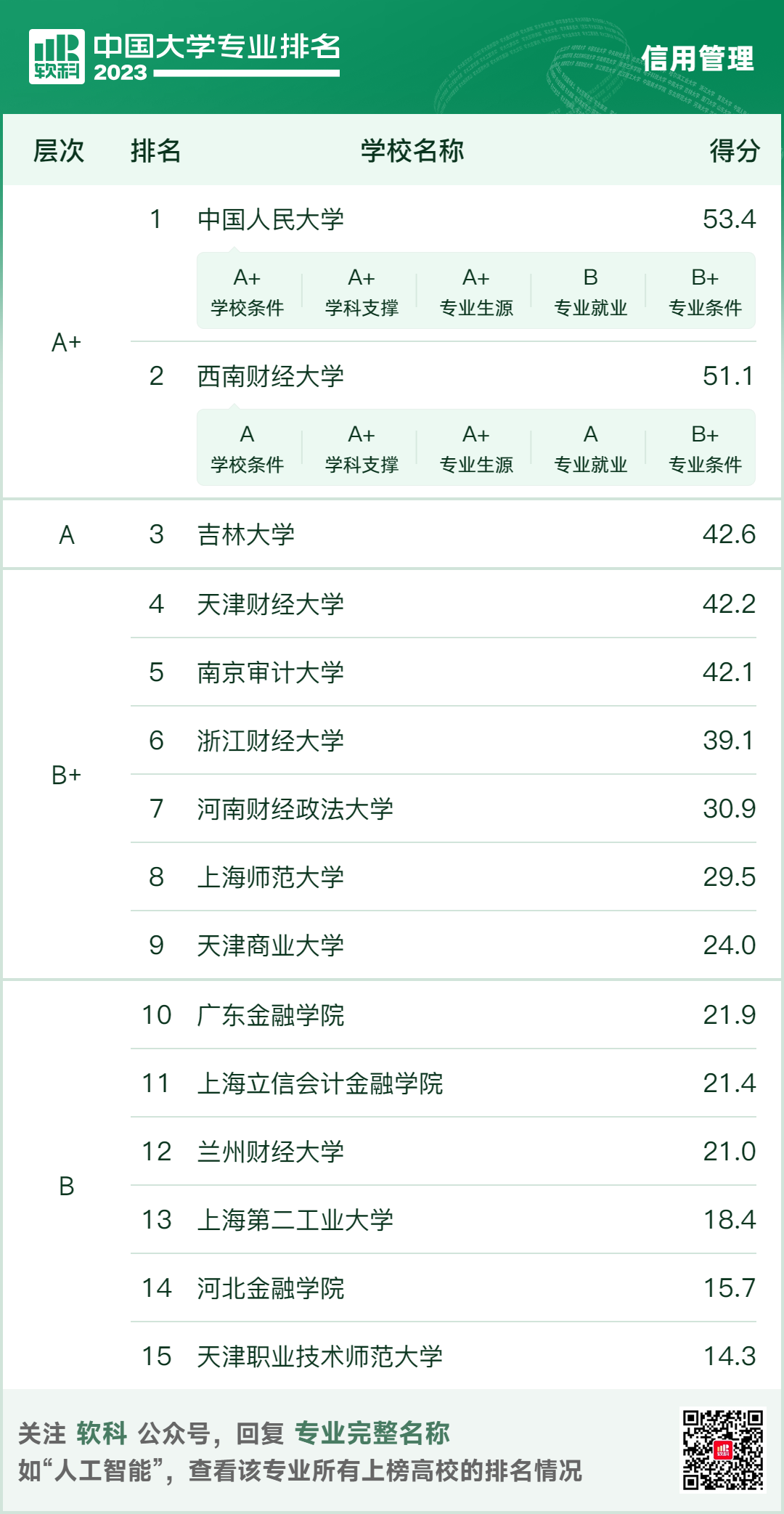 其中,信用管理專業(yè)排名結(jié)果如下: