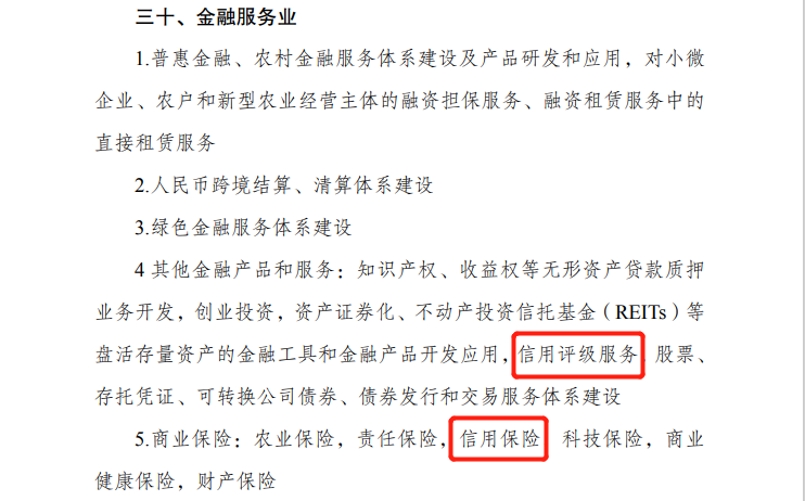 鼓勵類主要是對經(jīng)濟社會發(fā)展有重要促進作用的技術、裝備及產(chǎn)品,信用評級服務、信用保險、人力資源服務信用體系建設等都名列其中。