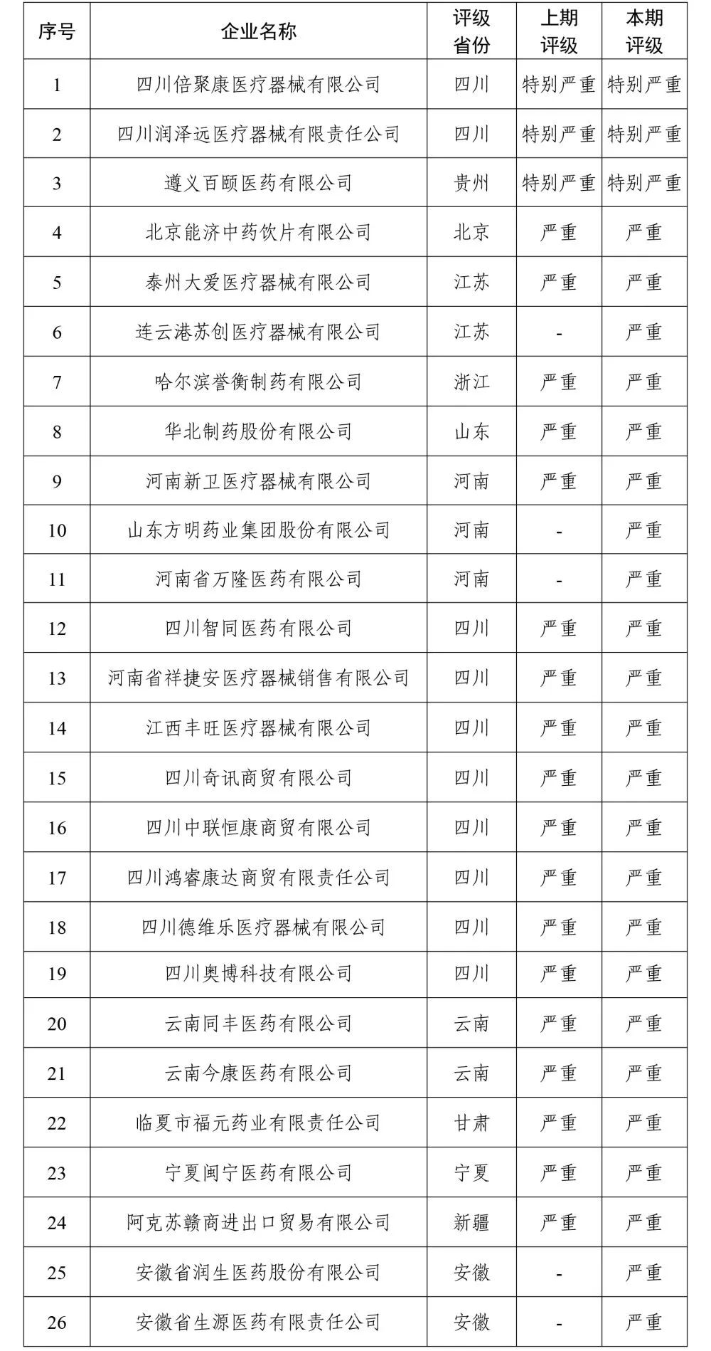 11月20日,國家醫(yī)保局醫(yī)藥價格和招標(biāo)采購指導(dǎo)中心發(fā)布了各省份評級為“特別嚴(yán)重”和“嚴(yán)重”失信的26家醫(yī)藥企業(yè)情況,其中23家醫(yī)藥企業(yè)評級為“嚴(yán)重”,3家醫(yī)藥企業(yè)評級為“特別嚴(yán)重”。