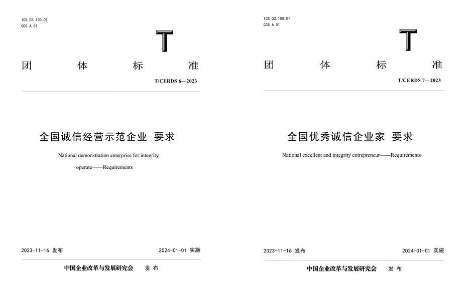 2023年11月16日,中國(guó)企業(yè)改革與發(fā)展研究會(huì)發(fā)布公告,批準(zhǔn)發(fā)布《全國(guó)誠(chéng)信經(jīng)營(yíng)示范企業(yè) 要求》(T/CERDS 6-2023)和《全國(guó)優(yōu)秀誠(chéng)信企業(yè)家 要求》(T/CERDS 7-2023)兩項(xiàng)團(tuán)體標(biāo)準(zhǔn),自2024年1月1日起實(shí)施。