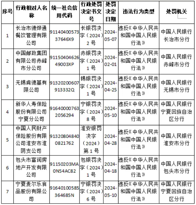 六、兩部門聯(lián)合公示因拒收現(xiàn)金受到行政處罰的主體