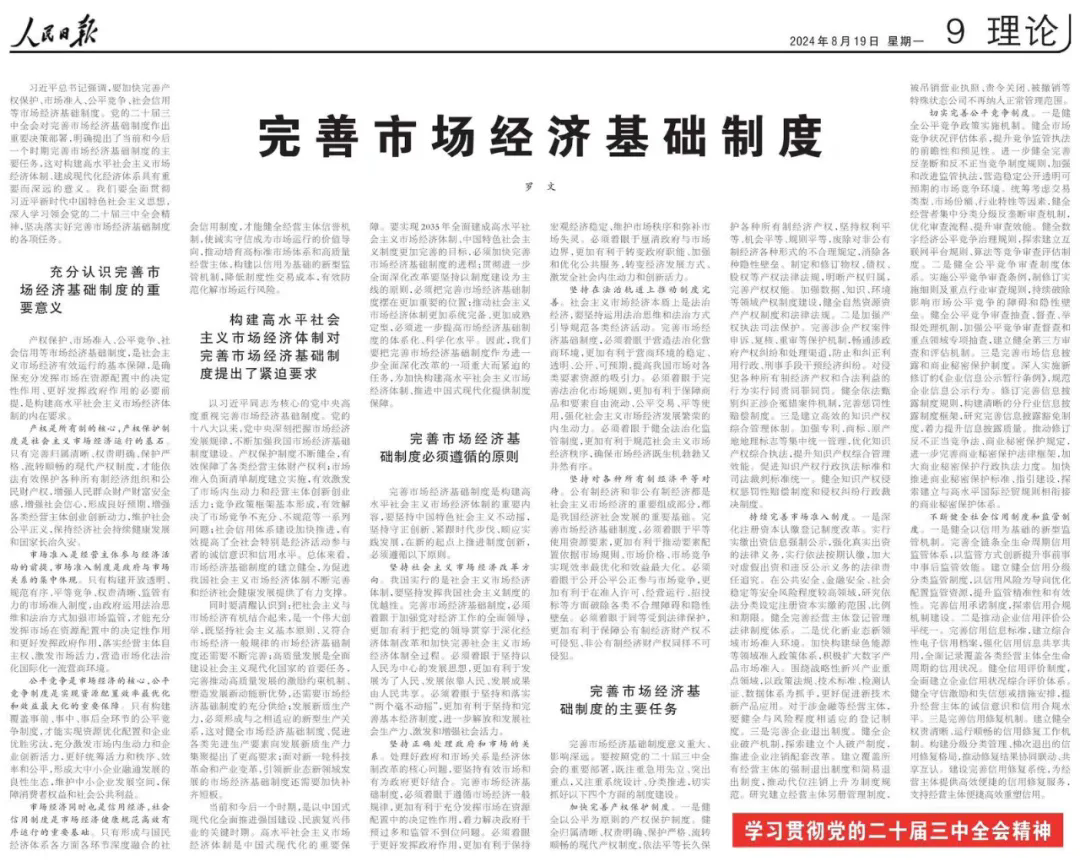 習(xí)近平總書記強(qiáng)調(diào),要加快完善產(chǎn)權(quán)保護(hù)、市場(chǎng)準(zhǔn)入、公平競(jìng)爭(zhēng)、社會(huì)信用等市場(chǎng)經(jīng)濟(jì)基礎(chǔ)制度。黨的二十屆三中全會(huì)對(duì)完善市場(chǎng)經(jīng)濟(jì)基礎(chǔ)制度作出重要決策部署,明確提出了當(dāng)前和今后一個(gè)時(shí)期完善市場(chǎng)經(jīng)濟(jì)基礎(chǔ)制度的主要任務(wù),這對(duì)構(gòu)建高水平社會(huì)主義市場(chǎng)經(jīng)濟(jì)體制、建成現(xiàn)代化經(jīng)濟(jì)體系具有重要而深遠(yuǎn)的意義。我們要全面貫徹習(xí)近平新時(shí)代中國特色社會(huì)主義思想,深入學(xué)習(xí)領(lǐng)會(huì)黨的二十屆三中全會(huì)精神,堅(jiān)決落實(shí)好完善市場(chǎng)經(jīng)濟(jì)基礎(chǔ)制度的各項(xiàng)任務(wù)。