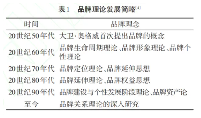 品牌理論的發(fā)展具有動(dòng)態(tài)性,它隨著社會(huì)變遷、商業(yè)形態(tài)、市場(chǎng)環(huán)境、技術(shù)進(jìn)步、規(guī)則改變等因素的變化不斷地適應(yīng)著時(shí)代。表1列出了品牌理論發(fā)展過(guò)程中出現(xiàn)的重要理論節(jié)點(diǎn)。