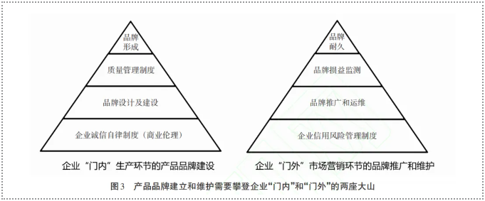 綜上所述,企業(yè)要建立產(chǎn)品品牌的聲譽(yù)和形成品牌競(jìng)爭(zhēng)力,需要上述各項(xiàng)制度保駕護(hù)航,要攀登上建立在誠(chéng)信磐石上的“兩座大山”,情形如圖3所示。