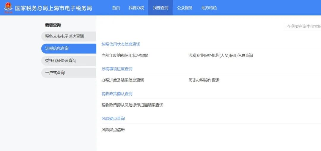 1. 登錄新電子稅局后,點(diǎn)擊【我要查詢(xún)】 -【涉稅信息查詢(xún)】-【涉稅專(zhuān)業(yè)服務(wù)機(jī)構(gòu)(人員)信用信息查詢(xún)】功能菜單。