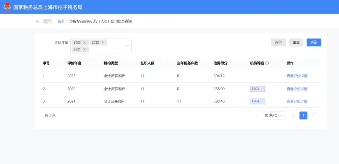 2. 選擇好查詢(xún)條件后,點(diǎn)擊查詢(xún),即可查看納稅人涉及的涉稅專(zhuān)業(yè)服務(wù)機(jī)構(gòu)信用信息。