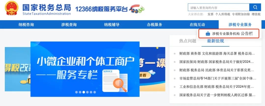 1.點(diǎn)擊【涉稅專(zhuān)業(yè)服務(wù)】-【涉稅服務(wù)機(jī)構(gòu)公告欄】。