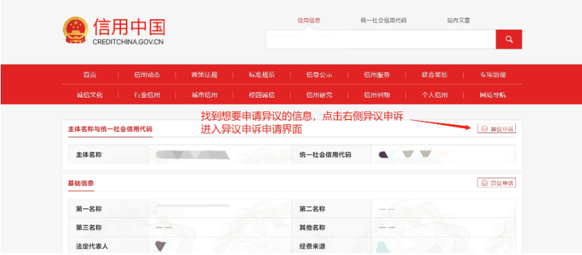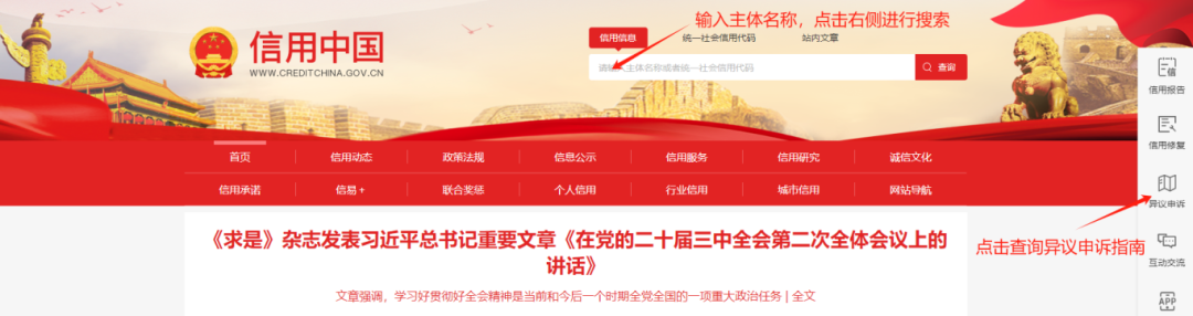 一、瀏覽器打開信用中國網(wǎng)站,點擊右側(cè)異議申訴,查詢異議申訴指南。在網(wǎng)站首頁的最上方輸入存在信用異議的主體名稱,點擊搜索。