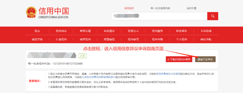 五、在信用信息詳情界面找到想要提出異議的信息,點擊右側(cè)“異議申訴”按鈕進入異議申訴申請界面。