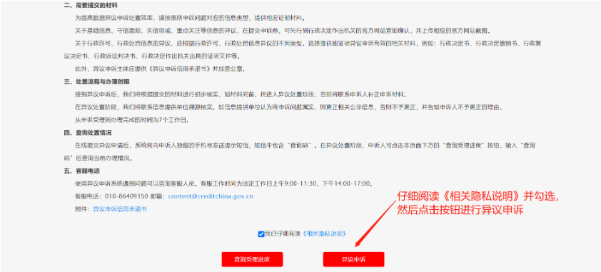 四、根據(jù)網(wǎng)頁指引,在詳細(xì)閱讀異議申訴流程,并下載《異議申訴信用承諾書》附件后,勾選最下方“我已仔細(xì)閱讀《相關(guān)隱私說明》”,然后點擊“異議申訴”按鈕進入異議申訴界面