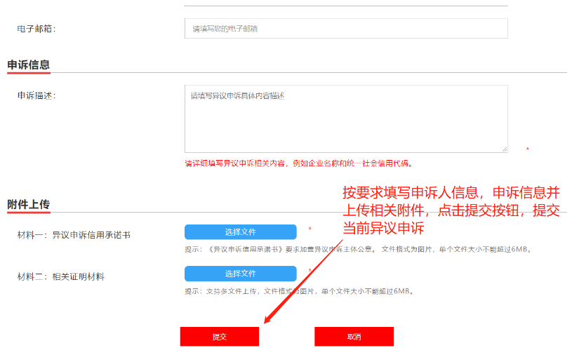六、按要求填寫申訴人信息,申訴信息并上傳相關(guān)附件,點擊提交按鈕,提交當(dāng)前異議申訴。
