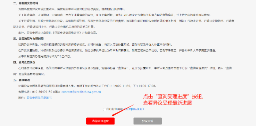 七、提交成功后,可按上述指引回到第三步的信用信息異議申訴指南頁面,點擊最下方“查詢受理進度”來查看異議受理最新進度。