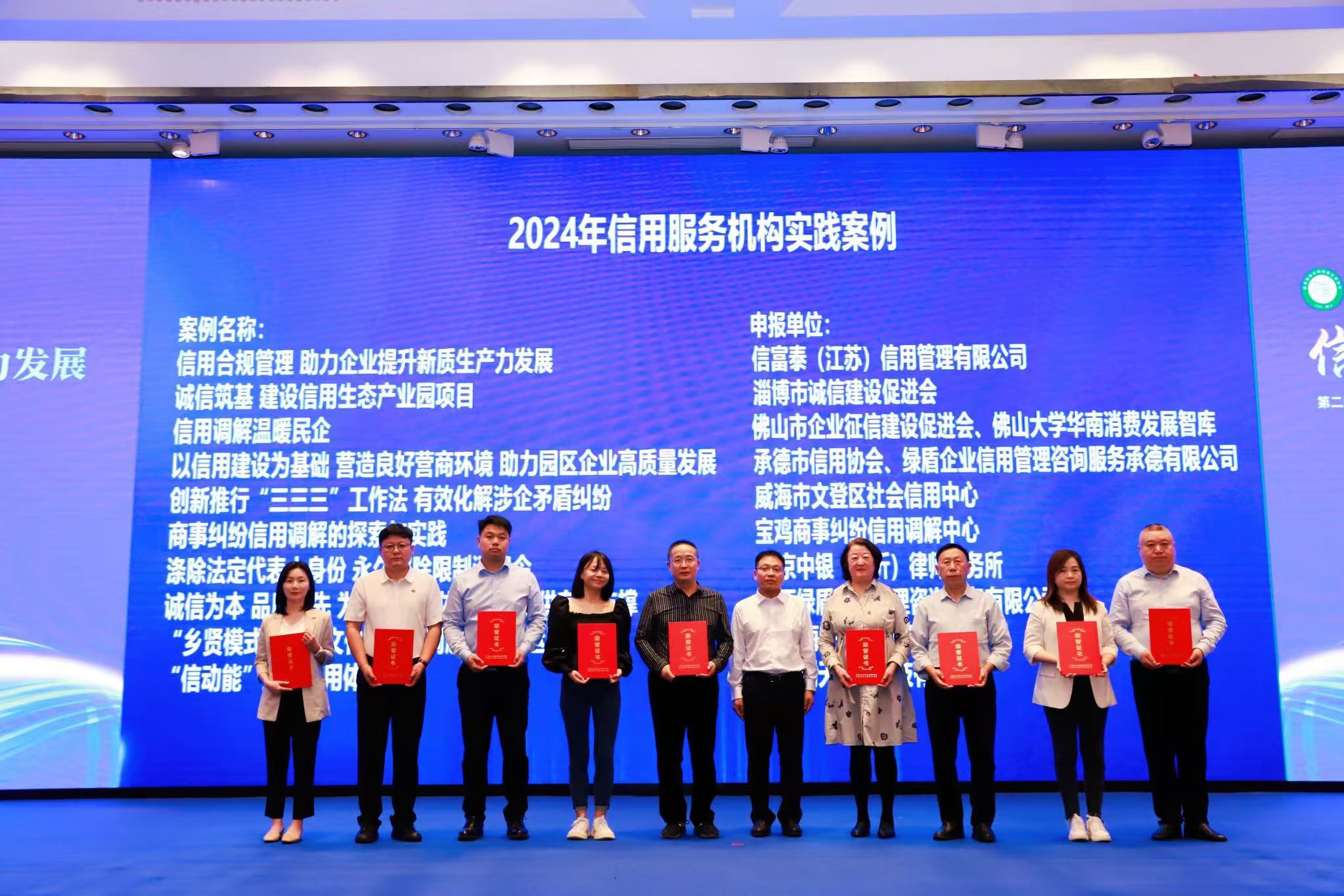 本次會(huì)議中,發(fā)布了2024年信用服務(wù)機(jī)構(gòu)實(shí)踐案例,信富泰(江蘇)信用管理有限公司、淄博市誠(chéng)信建設(shè)促進(jìn)會(huì)、佛山市企業(yè)征信建設(shè)促進(jìn)會(huì)、承德市信用協(xié)會(huì)、威海市文登區(qū)社會(huì)信用中心、寶雞商事糾紛信用調(diào)解中心、北京中銀(臨沂)律師事務(wù)所、江西綠盾信用管理咨詢服務(wù)有限公司、南通海子牛信用管理有限公司、山東刑天網(wǎng)絡(luò)科技有限公司的10項(xiàng)案例入選,中國(guó)企業(yè)改革與發(fā)展研究會(huì)常務(wù)副秘書(shū)長(zhǎng)李華為入選單位頒發(fā)的證書(shū)。