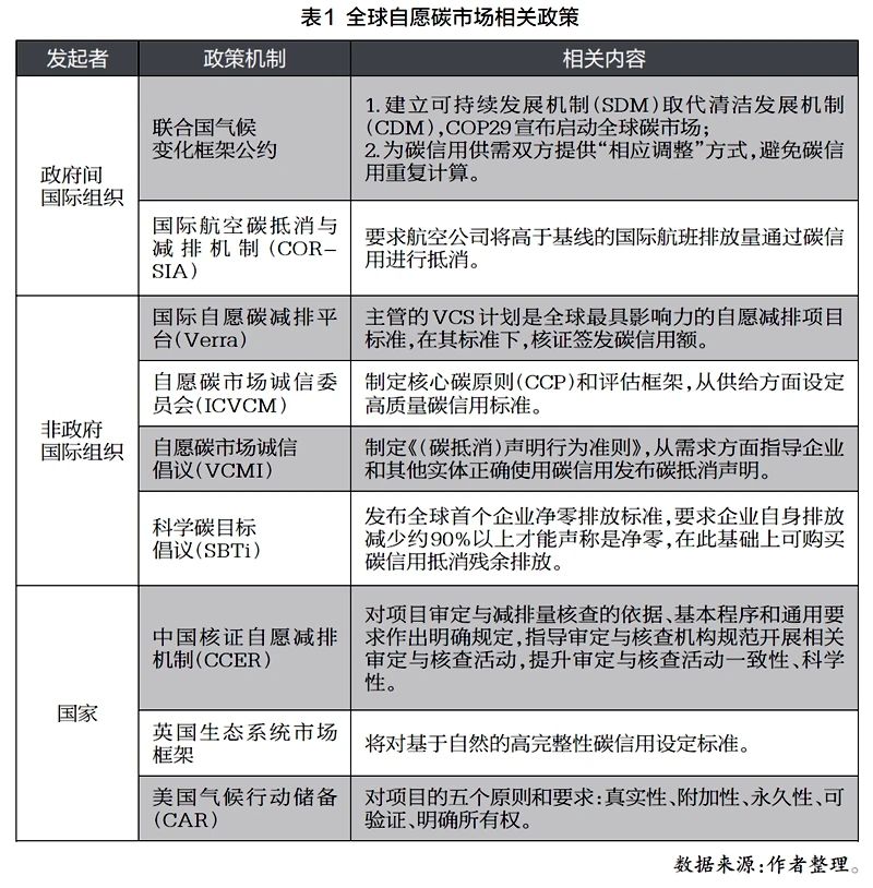 目前,國際上自愿減排市場存在種類繁多的機(jī)制標(biāo)準(zhǔn)和規(guī)則體系,呈現(xiàn)分散和多元化特點。從發(fā)起管理者來看,包括政府間國際組織、非政府國際組織及國家等三種類型。政府間國際組織層面,主要是《聯(lián)合國氣候變化框架公約》下建立的清潔發(fā)展機(jī)制(CDM),近期第二十九次締約方大會(COP29)就第6.4條的碳信用標(biāo)準(zhǔn)達(dá)成共識,推動全球碳信用交易機(jī)制逐步趨向一體化。國際民航組織推動建立的國際航空碳抵消和減排交易機(jī)制(CORSIA);非政府第三方國際機(jī)構(gòu)方面如國際自愿碳減排平臺(VERRA)等,目前占據(jù)主導(dǎo)地位。同時,全球高質(zhì)量自愿碳市場理事會(ICVCM)成立后,推出了旨在全球形成高質(zhì)量碳信用的統(tǒng)一標(biāo)準(zhǔn)CCP;國家層面如中國核證自愿減排機(jī)制(CCER)、美國氣候行動儲備(CAR)等。從機(jī)制內(nèi)容看,從碳信用的供給、需求及交易等方面提出建議和要求,重點對提高碳信用可信度進(jìn)行規(guī)定。總體來看,目前多數(shù)政策和標(biāo)準(zhǔn)不完善,且未形成強(qiáng)制約束。(見表1)