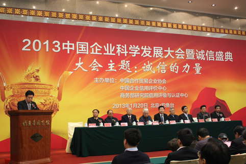 2013年1月20日,由中國合作貿(mào)易企業(yè)協(xié)會(huì)、商務(wù)部研究院信用評(píng)級(jí)與認(rèn)證中心聯(lián)合舉辦的“2013中國企業(yè)科學(xué)發(fā)展大會(huì)暨誠信盛典”在京隆重舉行,主題是“誠信的力量”。大會(huì)發(fā)布了2012中國企業(yè)信用100強(qiáng),并同期發(fā)布《中國企業(yè)信用發(fā)展報(bào)告2012》,這是國內(nèi)首次推出中國企業(yè)信用100強(qiáng)分析研究報(bào)告。全國人大、中共中央政策研究室、國務(wù)院研究室、國務(wù)院發(fā)展研究中心、國務(wù)院新聞辦公室、國務(wù)院國資委、國家發(fā)改委、商務(wù)部、工信部、聯(lián)合國工發(fā)組織等有關(guān)領(lǐng)導(dǎo)、著名專家學(xué)者,以及2012中國企業(yè)信用100強(qiáng)代表和誠信企業(yè)、企業(yè)家代表,約500多人參加了大會(huì)。