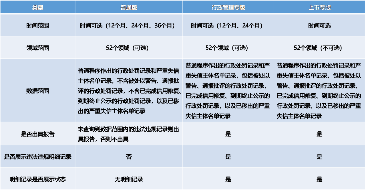 【報告類別】經(jīng)營主體公共信用報告(無違法違規(guī)記錄證明版),分為普通版、行政管理專版和上市專版,普通版主要適用于政策優(yōu)惠、商務(wù)經(jīng)營等一般領(lǐng)域,行政管理專版主要針對辦理依申請行政事項的具體要求,上市專版主要針對上市融資的具體要求。