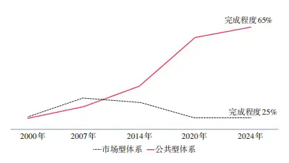然而,10多年來,對公共型體系和市場型體系建設(shè)工作的推進(jìn)極不平衡,兩種類型體系建設(shè)的推動(dòng)進(jìn)程和完成程度大致如圖2所示。