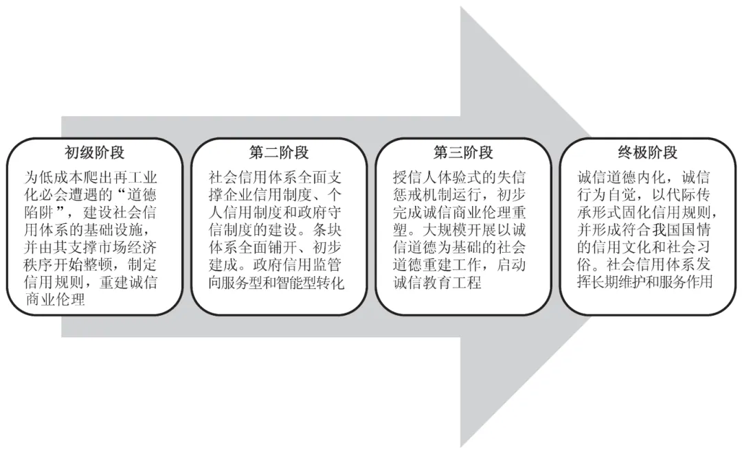 比較英國、法國、美國、日本和新加坡跨越工業(yè)化“道德陷阱”和社會(huì)道德重建的經(jīng)歷,參照我國建設(shè)和運(yùn)行社會(huì)信用體系的歷程,我們可以推論出社會(huì)道德重建和商業(yè)倫理重塑是具有規(guī)律性的。要實(shí)現(xiàn)愿景設(shè)立的任務(wù)目標(biāo),社會(huì)信用體系建設(shè)須取得若干個(gè)階段性的成果,長期循序漸進(jìn)地持續(xù)推進(jìn),大致情況如圖3所示。