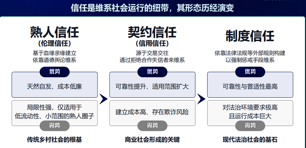 信任,如同無形的空氣,維系著社會經(jīng)濟的運轉(zhuǎn)?;赝浒l(fā)展脈絡(luò),我們大體上經(jīng)歷了三種主要形態(tài):