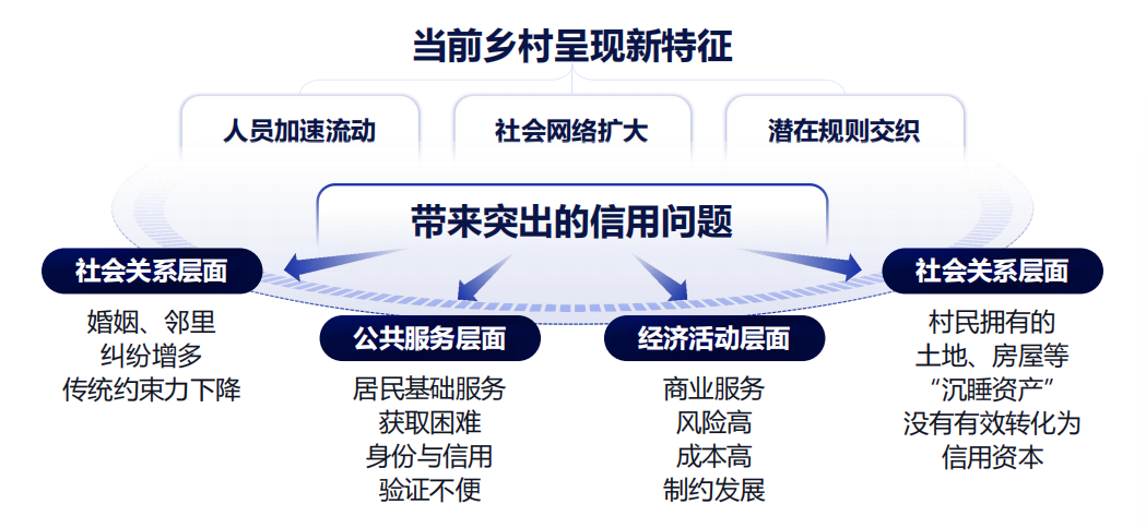 這些變化,帶來了信任機制困境:一是社會關(guān)系層面,鄰里糾紛更加復雜,道德約束力和宗族影響力顯著下降,亟需新的、更普遍的信任紐帶。二是公共服務(wù)層面,村民獲取公共服務(wù)與城市存在差距,例如信貸服務(wù),依舊困難,源于身份識別和信用風控手段不便,制約了公共服務(wù)的深入。三是經(jīng)濟活動層面,鄉(xiāng)村商業(yè)活動(如農(nóng)資賒銷、小額信貸)依然風險高、成本高,束縛了鄉(xiāng)村經(jīng)濟的活力。四是資產(chǎn)轉(zhuǎn)化層面,村民手中寶貴的土地承包權(quán)、宅基地使用權(quán)、農(nóng)房等“沉睡資產(chǎn)”,沒有有效轉(zhuǎn)化為發(fā)展亟需的信用資本。客觀的說,信用差異是鄉(xiāng)村與城市的重要差異之一,也是另一種鴻溝。