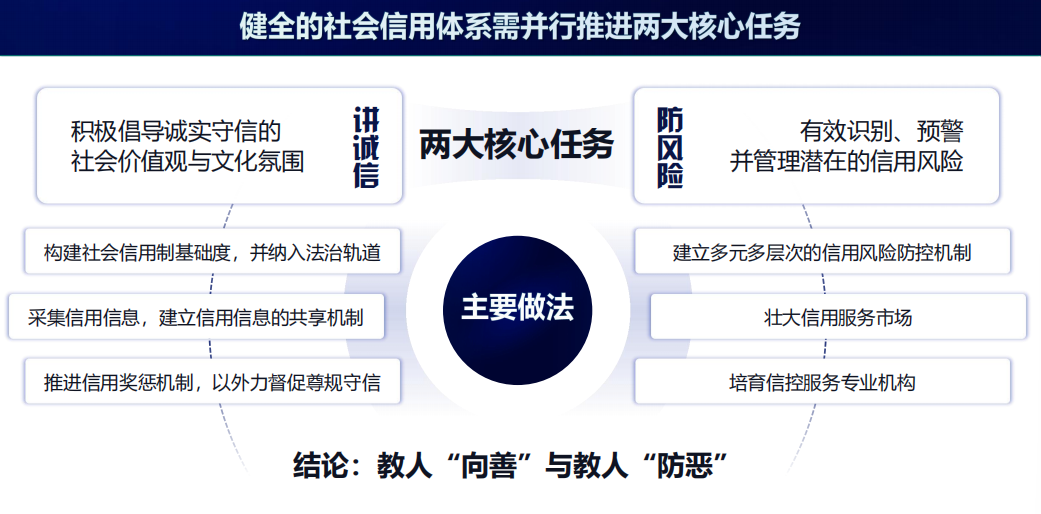 這兩條腿都很重要,“教人向善”與“教人防惡”相輔相成,缺一不可,一套成熟的社會信用體系,必須同時具備引導正向行為和遏制負向行為的雙重能力。但從操作角度,我們認為“防風險”更直接更快捷,“教人防惡”比“教人向善”更容易些。(要大力培育信控服務(wù)業(yè))