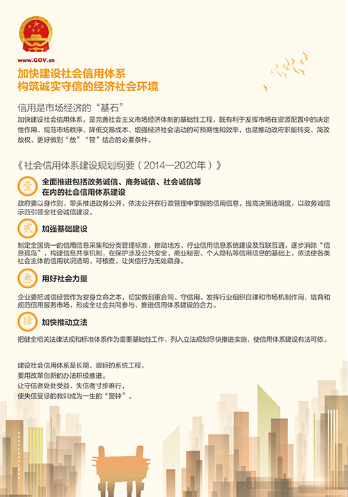 會議原則通過《社會信用體系建設(shè)規(guī)劃綱要(2014—2020年)》,并要求:一是全面推進包括政務(wù)誠信、商務(wù)誠信、社會誠信等在內(nèi)的社會信用體系建設(shè)。政府要以身作則,帶頭推進政務(wù)公開,依法公開在行政管理中掌握的信用信息,提高決策透明度,以政務(wù)誠信示范引領(lǐng)全社會誠信建設(shè)。二是加強基礎(chǔ)建設(shè)。制定全國統(tǒng)一的信用信息采集和分類管理標準,推動地方、行業(yè)信用信息系統(tǒng)建設(shè)及互聯(lián)互通,逐步消除“信息孤島”,構(gòu)建信息共享機制,在保護涉及公共安全、商業(yè)秘密、個人隱私等信用信息的基礎(chǔ)上,依法使各類社會主體的信用狀況透明、可核查,讓失信行為無處藏身。三是用好社會力量。企業(yè)要把誠信經(jīng)營作為安身立命之本,切實做到重合同、守信用。發(fā)揮行業(yè)組織自律和市場機制作用,培育和規(guī)范信用服務(wù)市場,形成全社會共同參與、推進信用體系建設(shè)的合力。四是加快推動立法。把健全相關(guān)法律法規(guī)和標準體系作為重要基礎(chǔ)性工作,列入立法規(guī)劃盡快推進實施,使信用體系建設(shè)有法可依。