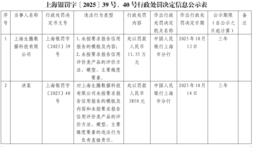 根據(jù)行政處罰決定書,上海生騰數(shù)據(jù)科技有限公司在信用信息管理中存在兩項(xiàng)違規(guī)行為:一是未按要求報(bào)告信用報(bào)告的模板及內(nèi)容,二是未按要求報(bào)告信用評(píng)價(jià)類產(chǎn)品的評(píng)價(jià)方法、模型及主要維度要素。中國(guó)人民銀行上海市分行對(duì)上海生騰數(shù)據(jù)科技有限公司處以罰款人民幣 11.55 萬元,處罰決定于2025年10月13日作出。同時(shí),對(duì)直接責(zé)任人洪某處以罰款人民幣3850元,處罰決定于2025年10月14日作出。