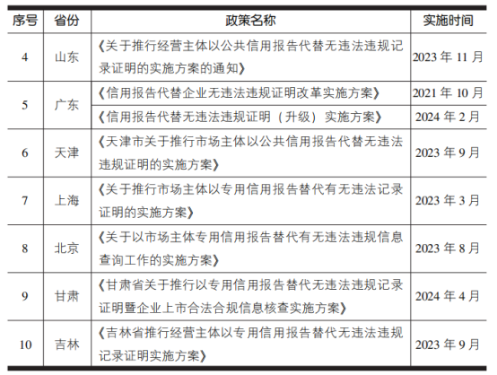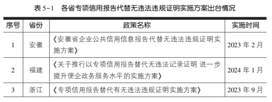 按照先立后破的原則,截至2024年6月,山東、安徽、福建、天津等10個省份印發(fā)了專項信用報告代替無違法違規(guī)證明的實施方案(見表5-1),重點明確專項信用報告獲取途徑、應(yīng)用場景、代替范圍等內(nèi)容。