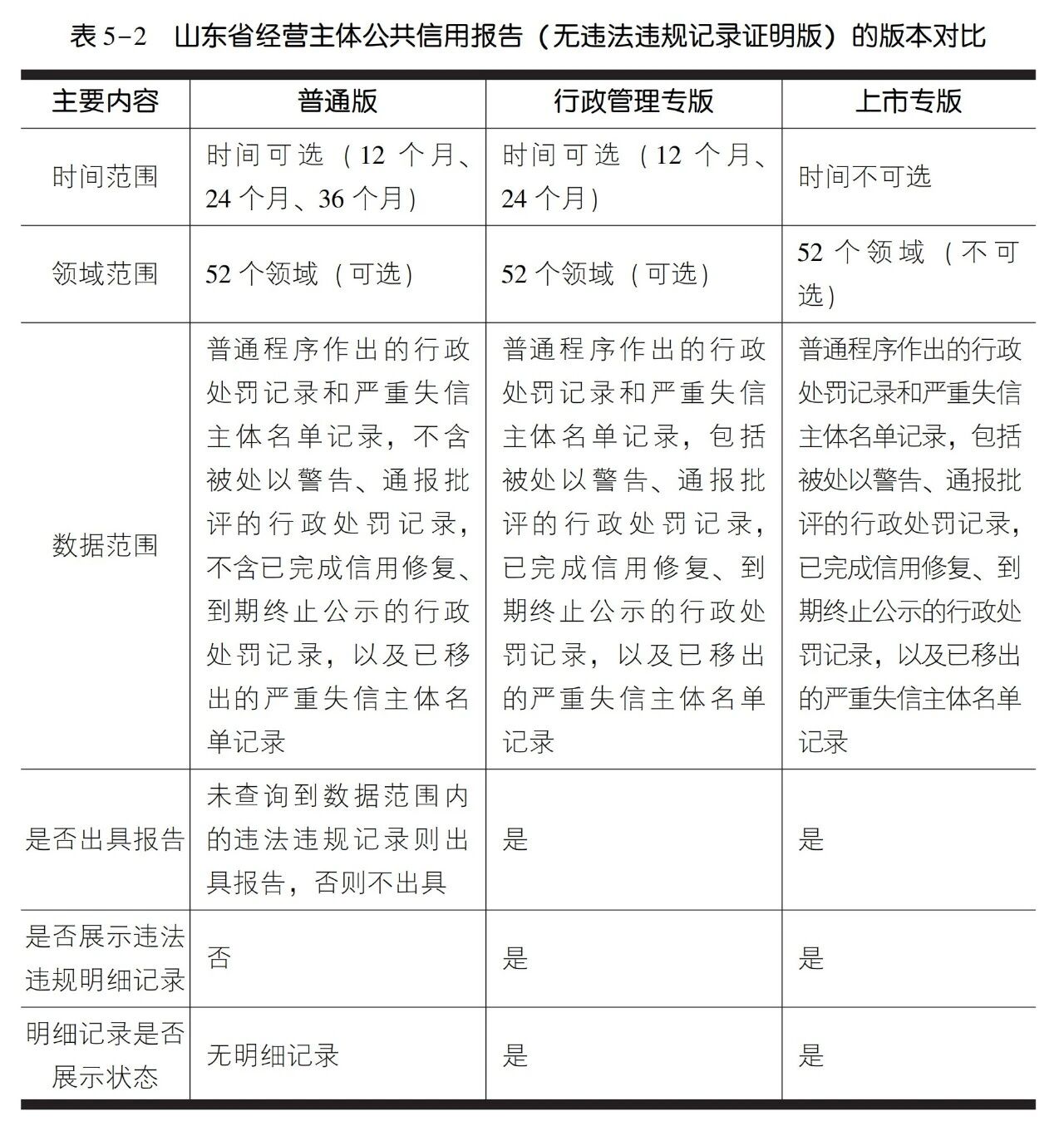 大多數(shù)省份僅推出一個信用報告版本,如廣東推出“企業(yè)信用報告(無違法違規(guī)證明版)”(見圖5-1)。浙江根據(jù)適用主體不同,推出“企業(yè)和社會組織專項信用報告”(見圖5-2)和“自然人專項信用報告”(見圖5-3)兩個版本。山東省則針對信用報告應(yīng)用場景的不同需求,將信用報告分為三個版本:普通版、行政管理專版和上市專版。其中,普通版主要適用于政策優(yōu)惠、商務(wù)經(jīng)營等一般領(lǐng)域,行政管理專版主要針對辦理依申請行政事項的具體要求,上市專版主要針對上市融資的具體要求(見表5-2)。