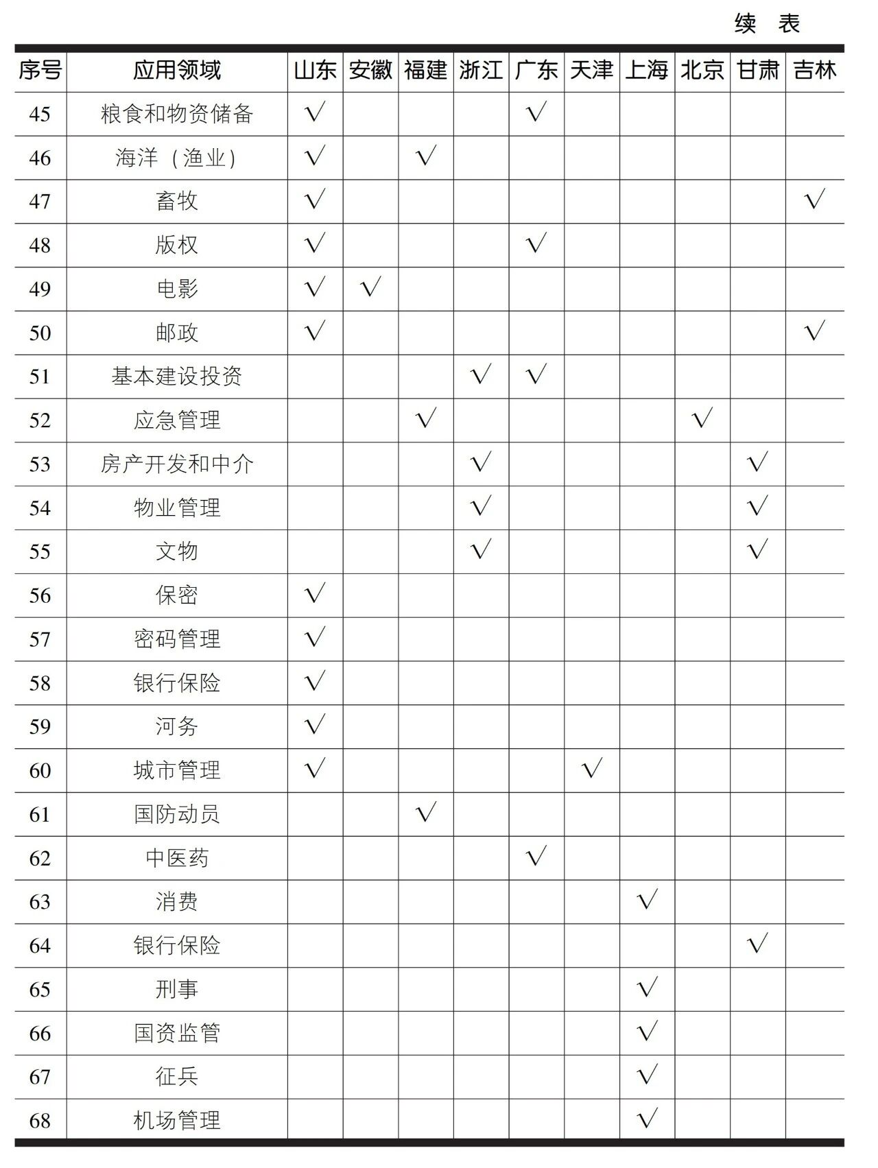 截至2024年6月,上述已推行專項信用報告的省份中,工業(yè)和信息化、公安、人力資源和社會保障、自然資源和規(guī)劃、生態(tài)環(huán)境、住房城鄉(xiāng)建設(shè)、交通運輸、水利、文化和旅游、衛(wèi)生健康、市場監(jiān)管、稅務(wù)等12個應(yīng)用場景已實現(xiàn)專項信用報告代替無違法違規(guī)證明全覆蓋(見表5-3)覆蓋領(lǐng)域最多的省份為山東(52個),覆蓋領(lǐng)域達(dá)到或超過40個的省份有5個,分別為山東、上海、吉林、安徽、浙江。此外,廣東、上海均為分批次擴大覆蓋領(lǐng)域,目前已增至第二批次。這也意味著未來各省專項信用報告代替無違法違規(guī)的領(lǐng)域范圍將分批次逐步延展。